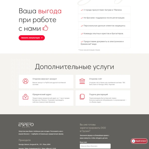Встречи и консультации с представителями компании Espero были продуктивными и информативными. Они обладают глубокими знаниями и опытом в сфере бизнеса в Грузии, что позволило мне получить подробные ответы на все мои вопросы и четкое понимание процесса регистрации ИП.