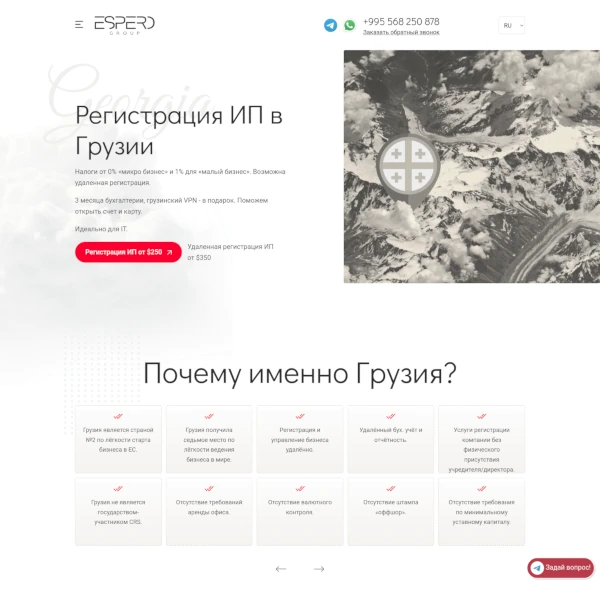 Я очень доволен своим опытом работы с компанией Espero. Их профессионализм, эффективность и внимательность к деталям сделали процесс регистрации ИП в Грузии гораздо проще и менее стрессовым для меня. Я рекомендую компанию Espero всем, кто ищет надежного партнера для оформления бизнеса в Грузии.